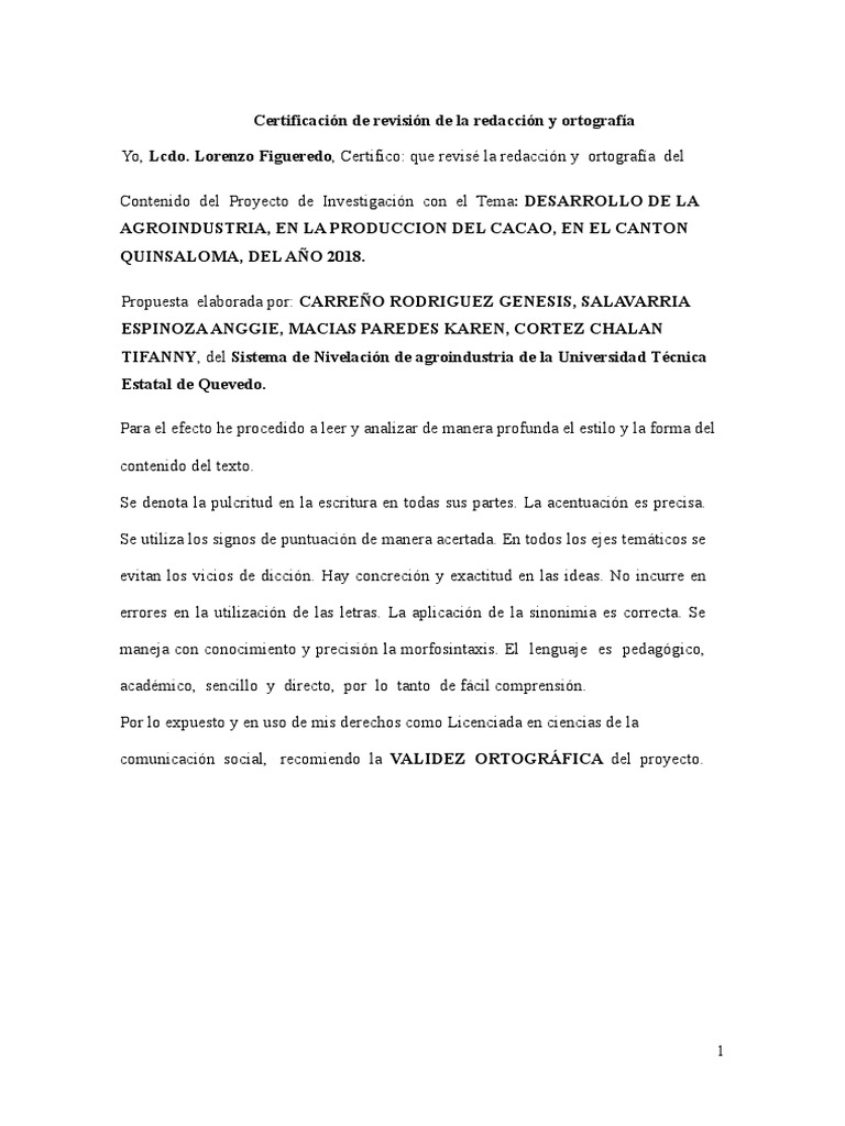 Yo, Lcdo. Lorenzo Figueredo, Certifico: que revisé la redacción y ortografía del