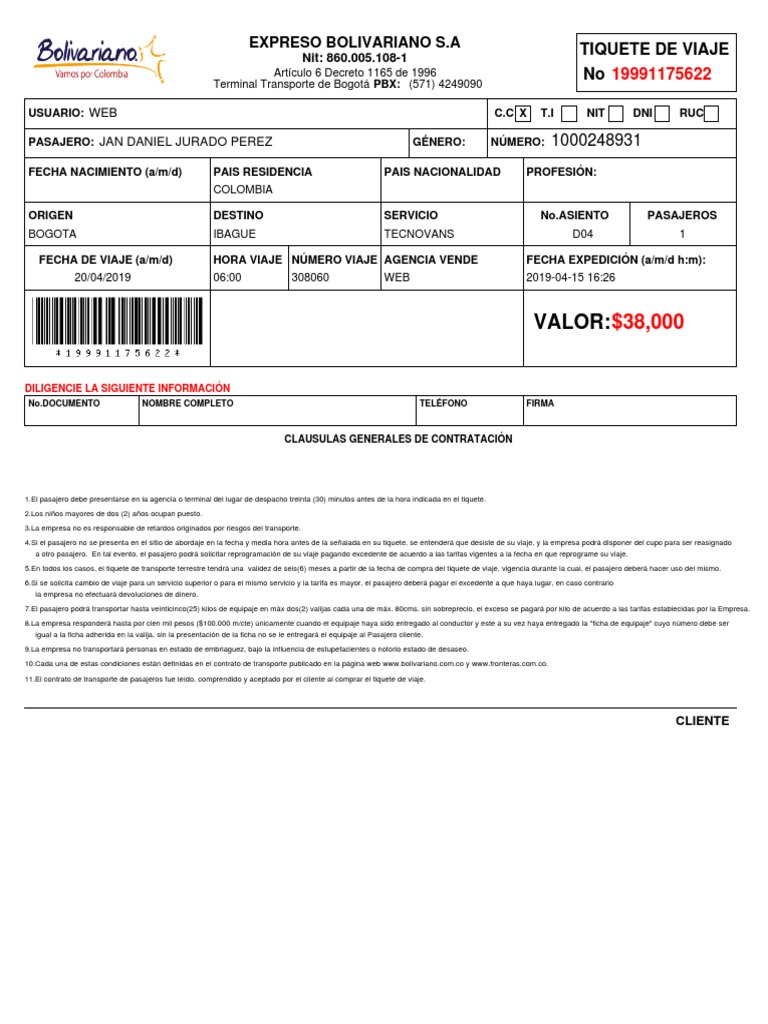 PASAJERO: JAN DANIEL JURADO PEREZ GÉNERO: NÚMERO: 1000248931