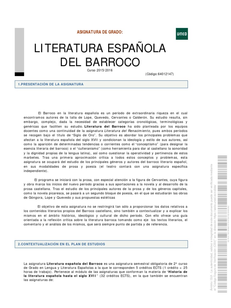 La asignatura Literatura española del Barroco es una asignatura semestral obligatoria de 2º curso