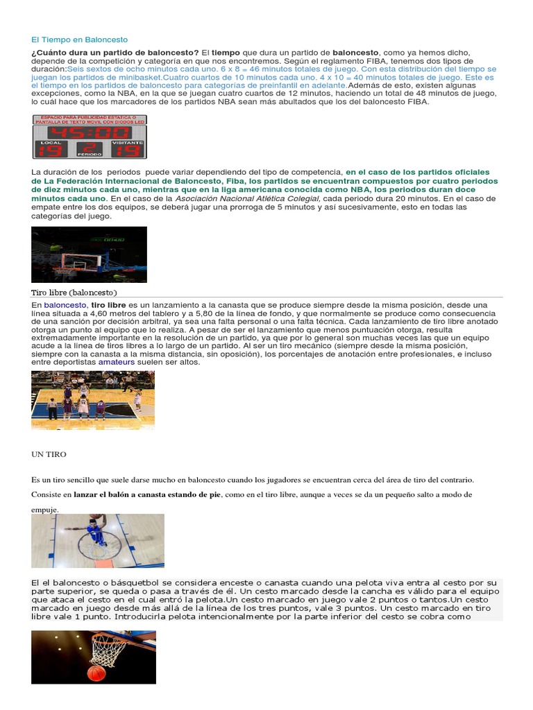 La duración de los partidos de baloncesto varía según la competición. En competiciones internacionales FIBA, los partidos consisten en cuatro periodos de 10 minutos, sumando un total de 40 minutos de juego . En cambio, en la NBA, cada partido se compone de cuatro periodos de 12 minutos, totalizando 48 minutos . Finalmente, en la NCAA, los partidos universitarios duran 40 minutos divididos en dos mitades de 20 minutos cada una . Estas diferencias en la duración pueden afectar el ritmo del juego, el tiempo de recuperación de los jugadores y la acumulación estratégica de puntos, siendo la NBA la liga con mayor duración individual de juego por partido.