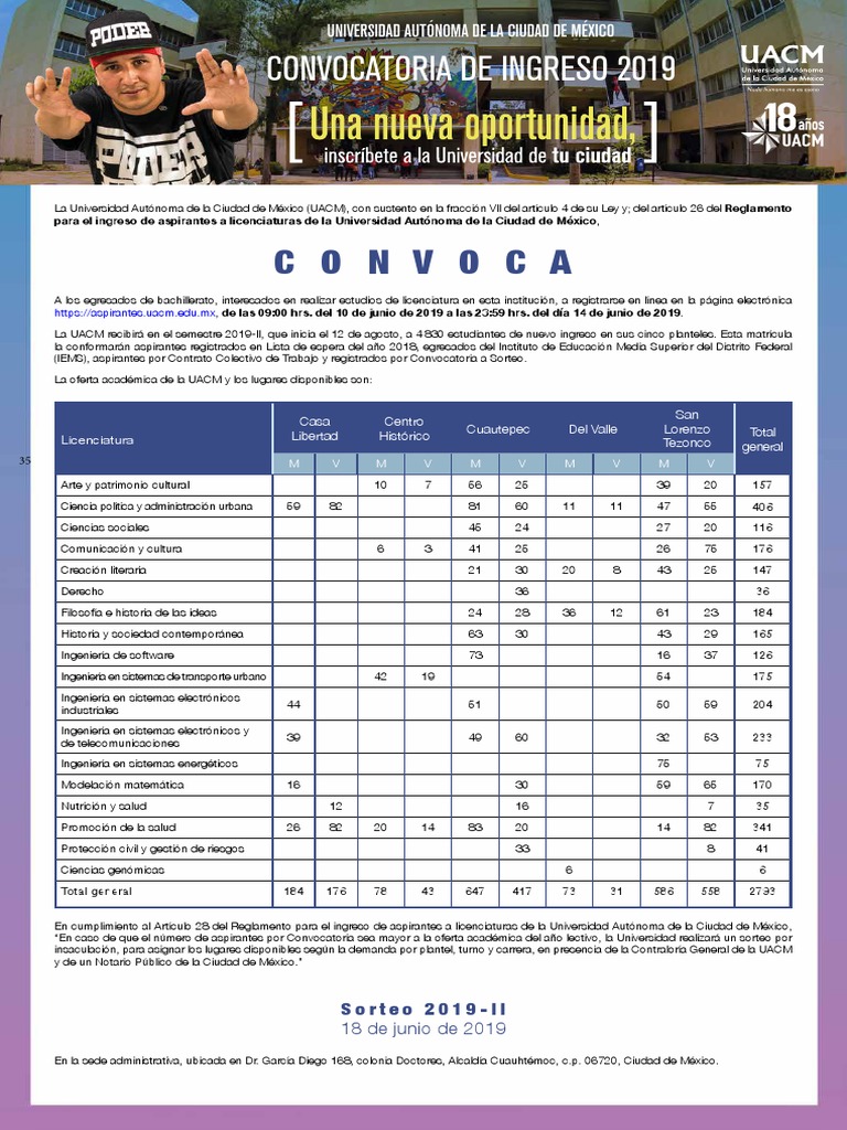 En cumplimiento al Artículo 28 del Reglamento para el ingreso de aspirantes a licenciaturas de la Universidad Autónoma de la Ciudad de México,