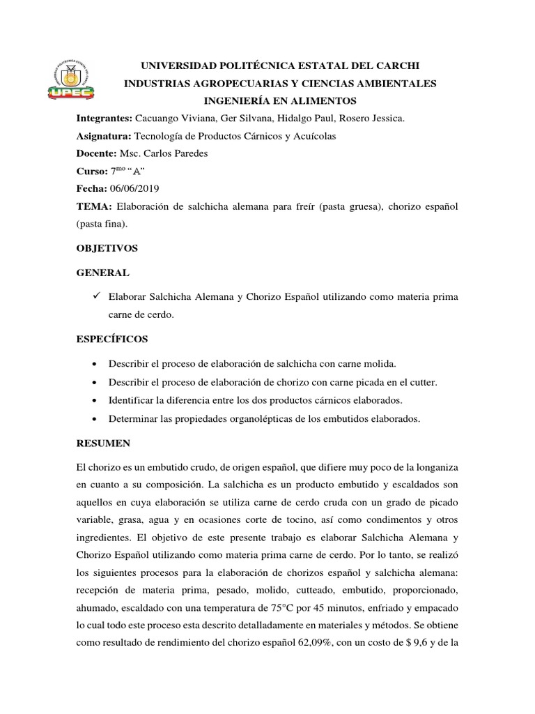 Chorizo Español utilizando como materia prima carne de cerdo. Por lo tanto, se realizó