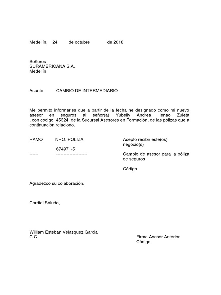 ------ --------------------- Cambio de asesor para la póliza