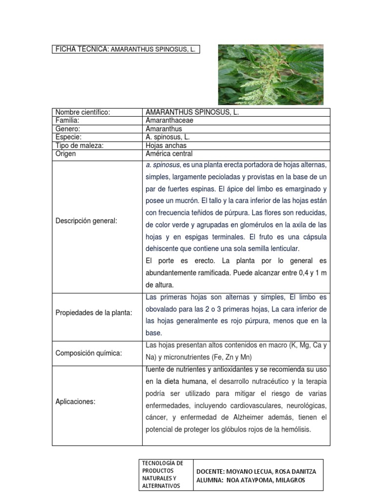 FICHA TÉCNICA: AMARANTHUS SPINOSUS, L.