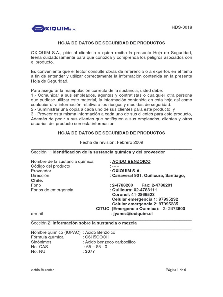 OXIQUIM S.A., pide al cliente o a quien reciba la presente Hoja de Seguridad,