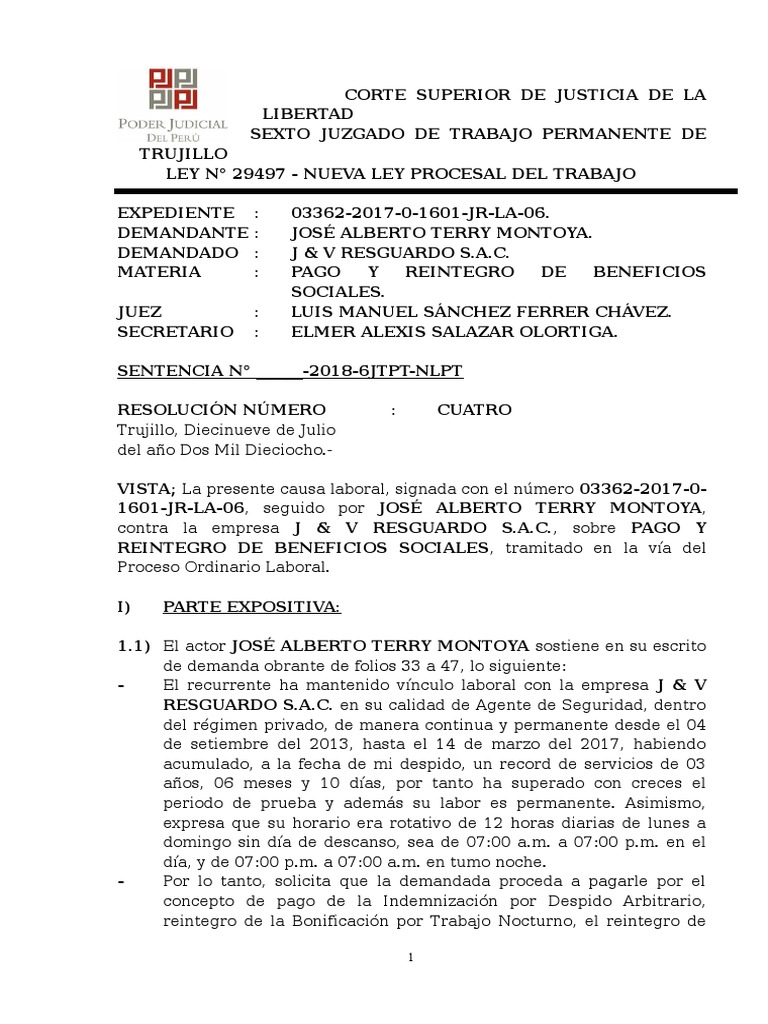 29497 de la ciudad de Trujillo, así la Primera Sala Laboral emitió