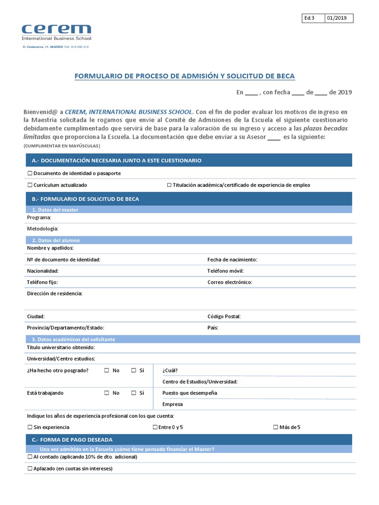 Bienvenid@ a CEREM, INTERNATIONAL BUSINESS SCHOOL. Con el fin de poder evaluar los motivos de ingreso en