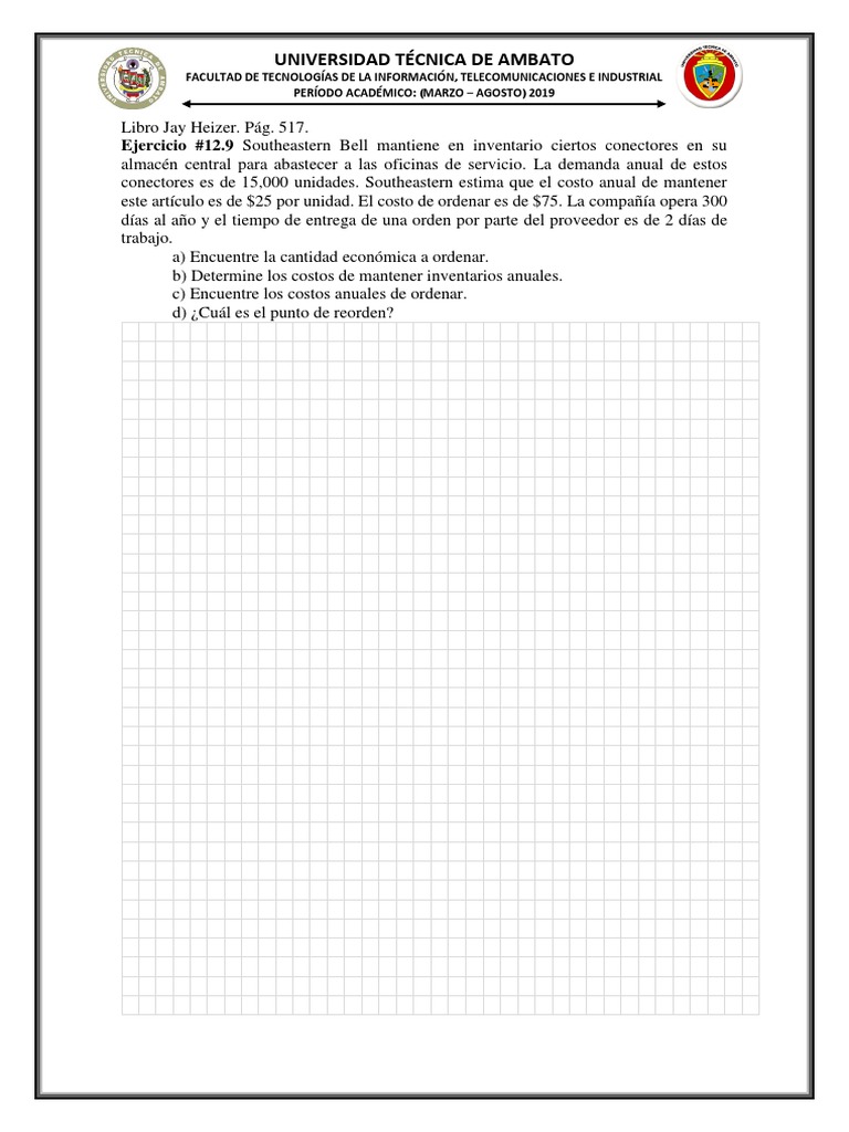 Ejercicio #12.9 Southeastern Bell mantiene en inventario ciertos conectores en su