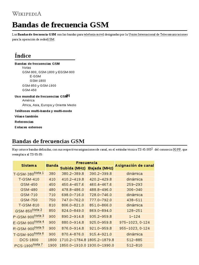 Esta obra contiene una traducción total derivada de GSM frequency bands de Wikipedia en inglés, concretamente