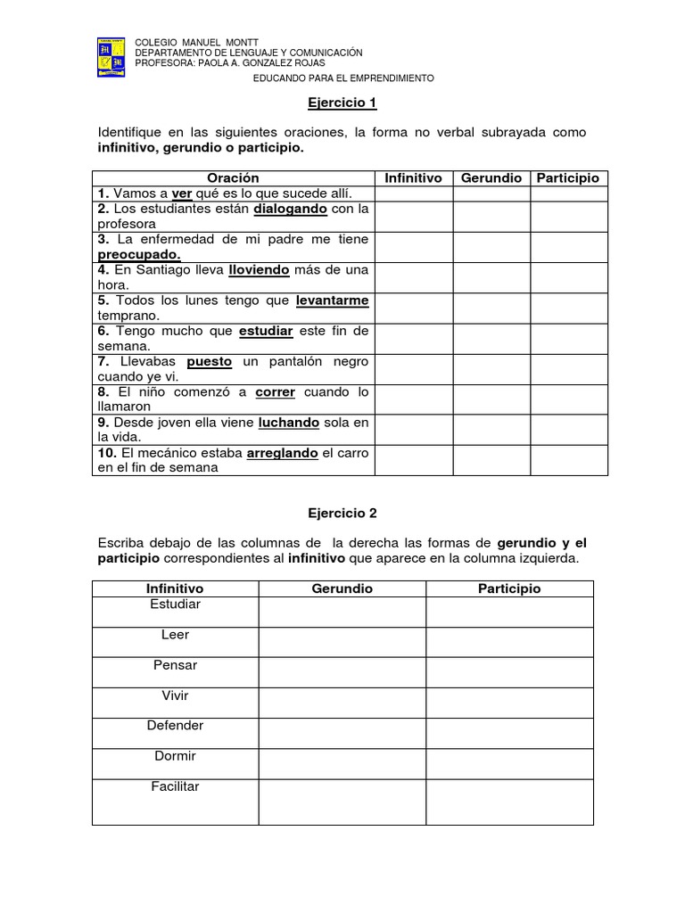 Escriba en los espacios en blanco la forma no personal correspondiente de