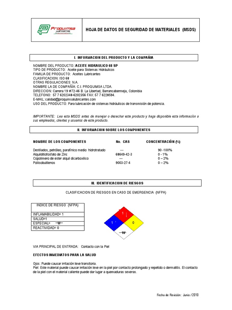 NOMBRE DEL PRODUCTO: ACEITE HIDRAULICO 68 SP
