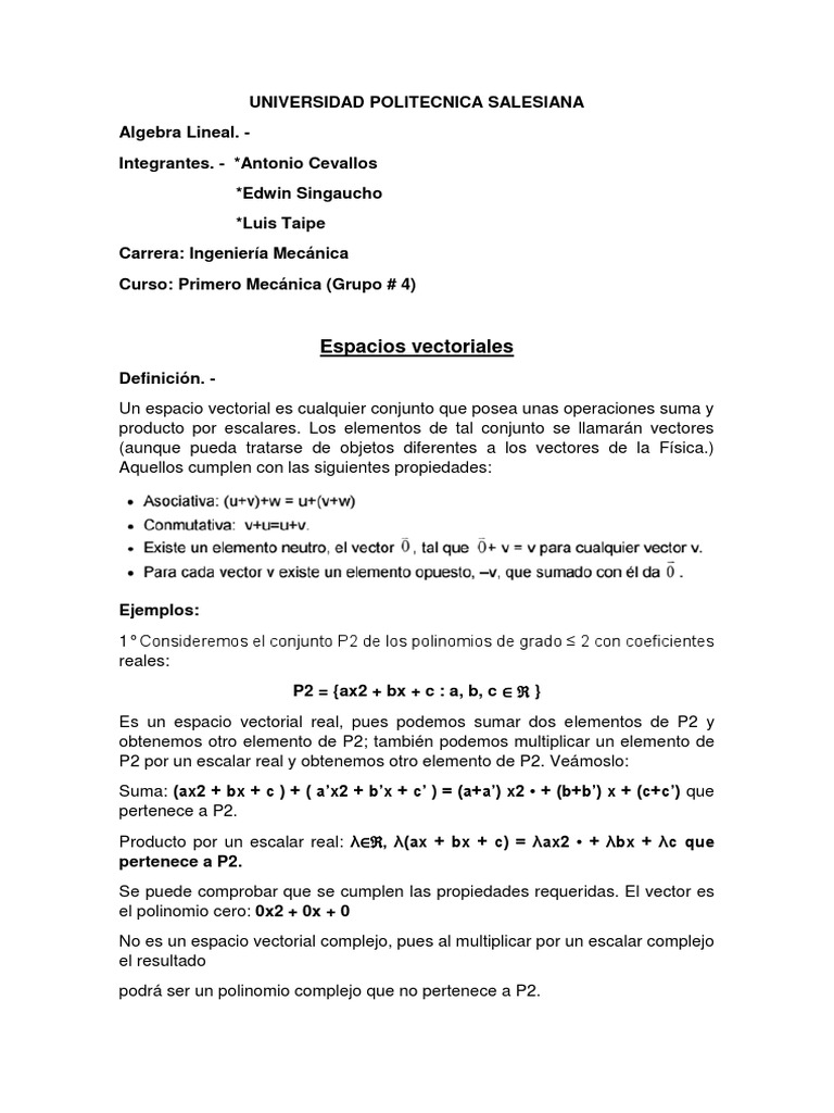 espacio vectorial si contiene al vector 0, y si al efectuar las operaciones de suma