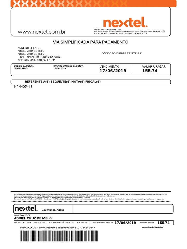 NOME DO CLIENTE ADRIEL CRUZ DE MELO ADRIEL CRUZ DE MELO R CAFE NATAL, 198 , CS02 VILA NATAL CEP: 04863-450 - SAO PAULO SP