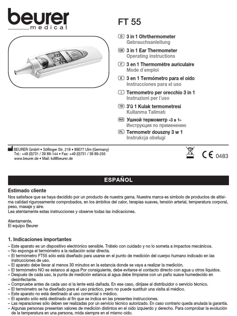 – Este aparato cumple la norma EN 12470-5 sobre termómetros clínicos y requisitos para los termómetros auriculares de