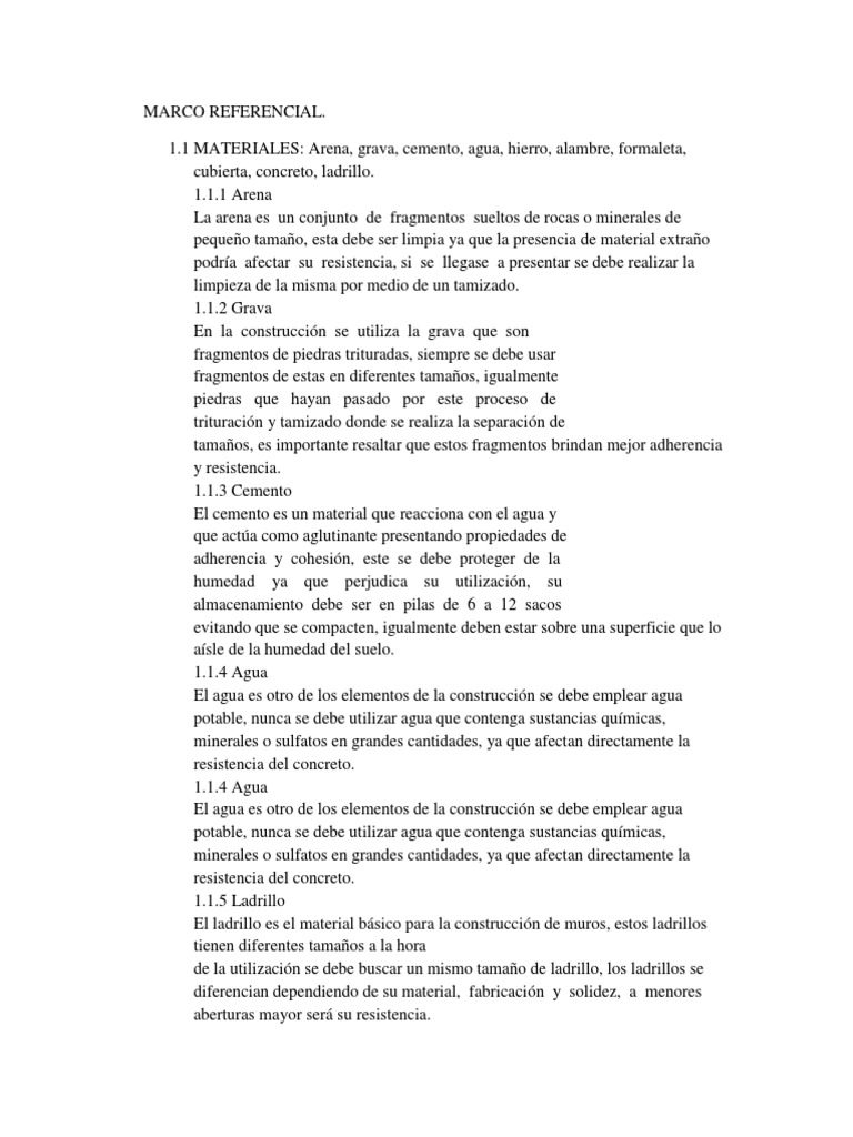 1.1 MATERIALES: Arena, grava, cemento, agua, hierro, alambre, formaleta,