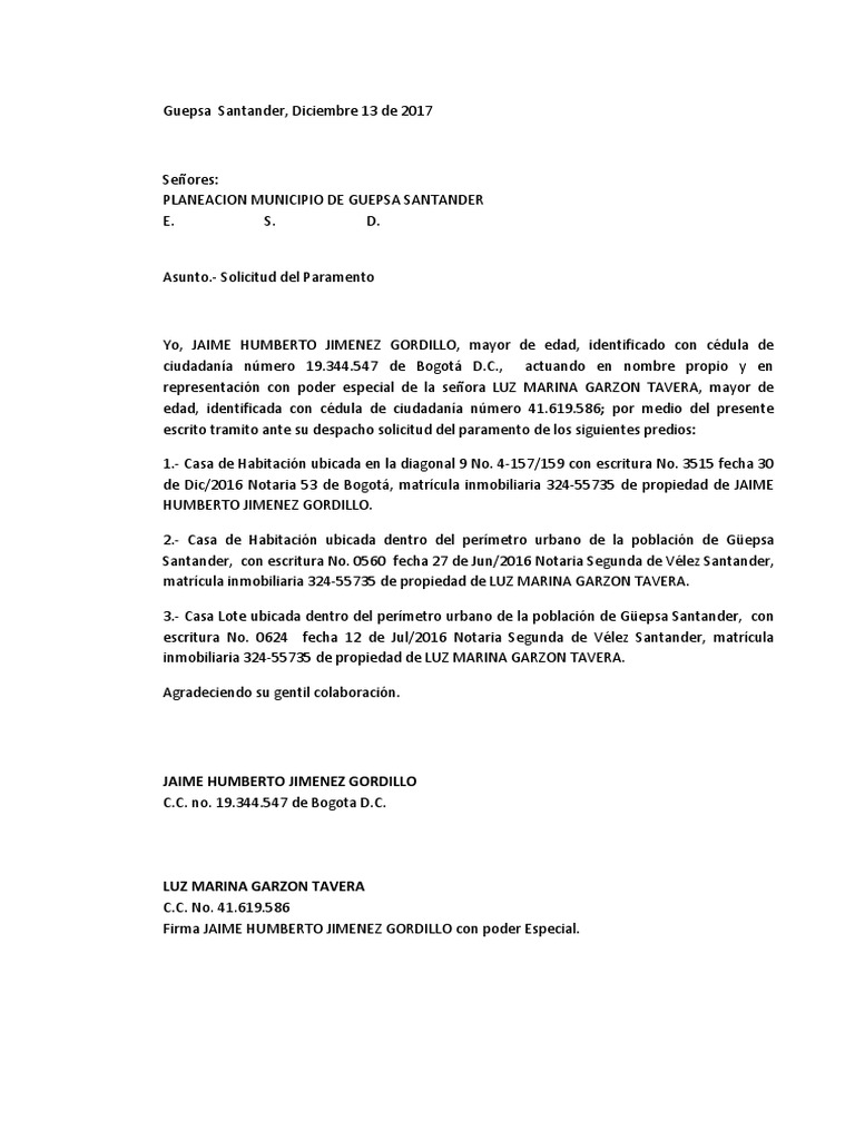 escrito tramito ante su despacho solicitud del paramento de los siguientes predios: