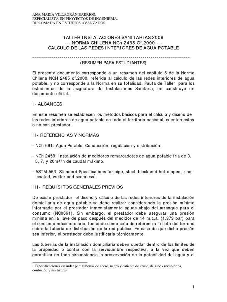 Chilena NCH 2485 of.2000, referida al cálculo de las redes interiores de agua