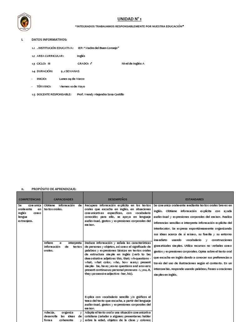 1.3 CICLO: III GRADO: 1° Nivel de Inglés: A