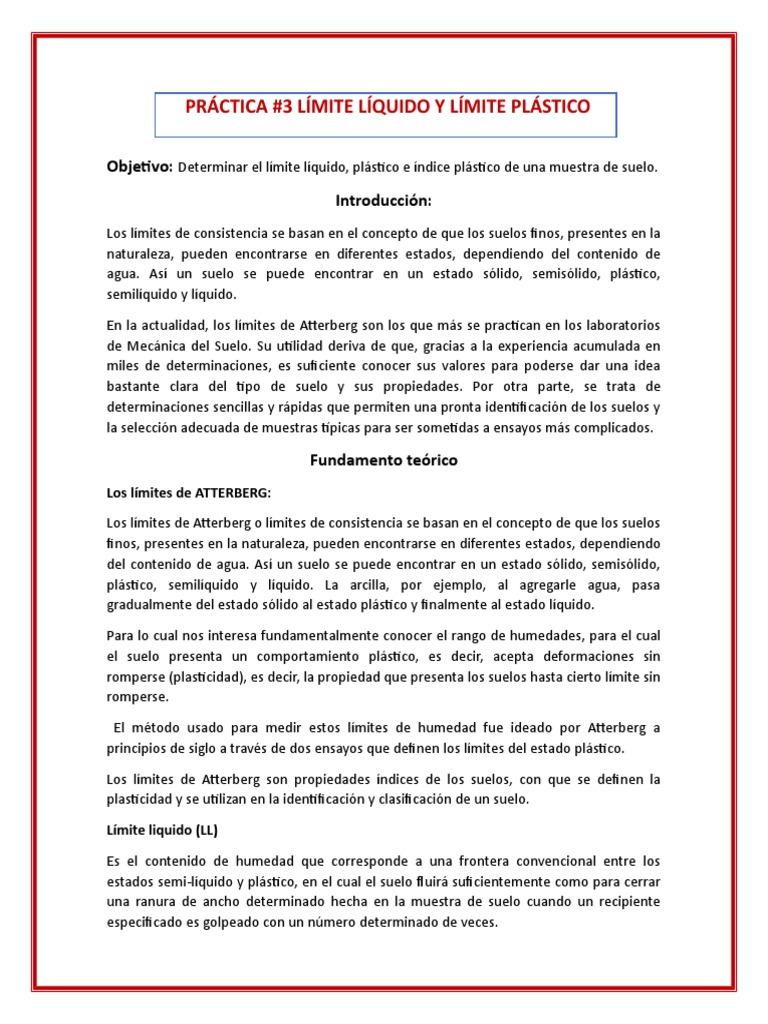 Objetivo: Determinar el límite líquido, plástico e índice plástico de una muestra de suelo.