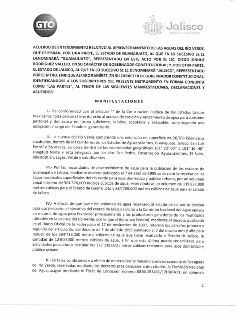 ‘Actecto de que parte del volumen de agua reservado al estado de Jalisco se destine