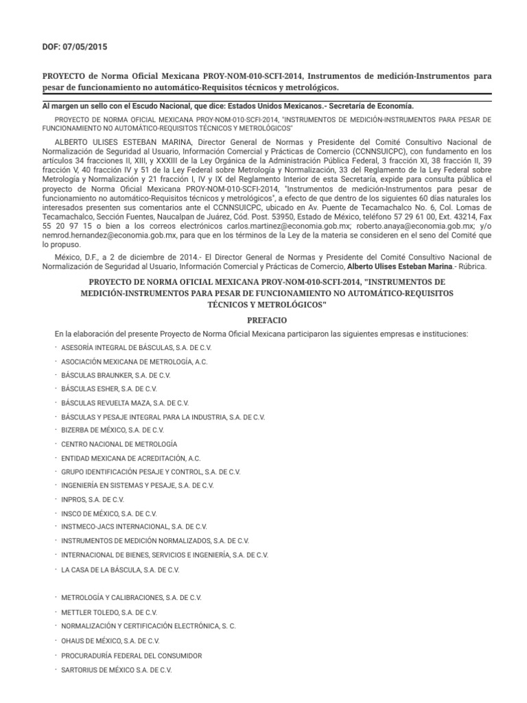 proyecto de Norma Oficial Mexicana PROY-NOM-010-SCFI-2014, "Instrumentos de medición-Instrumentos para pesar de