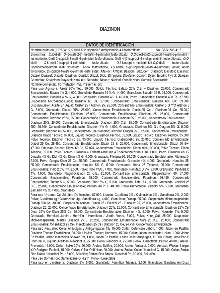 Granulado; Diazinon 60, 57.000, Concentrado Emulsionable; Diazinon Dragon 25 E, 25.000, Concentrado Emulsionable;