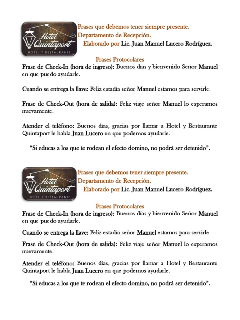 Frase de Check-In (hora de ingreso): Buenos días y bienvenido Señor Manuel