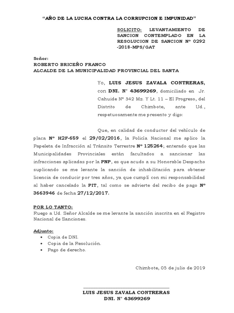 Ruego a Ud. Señor Alcalde se me levante la sanción inscrita en el Registro