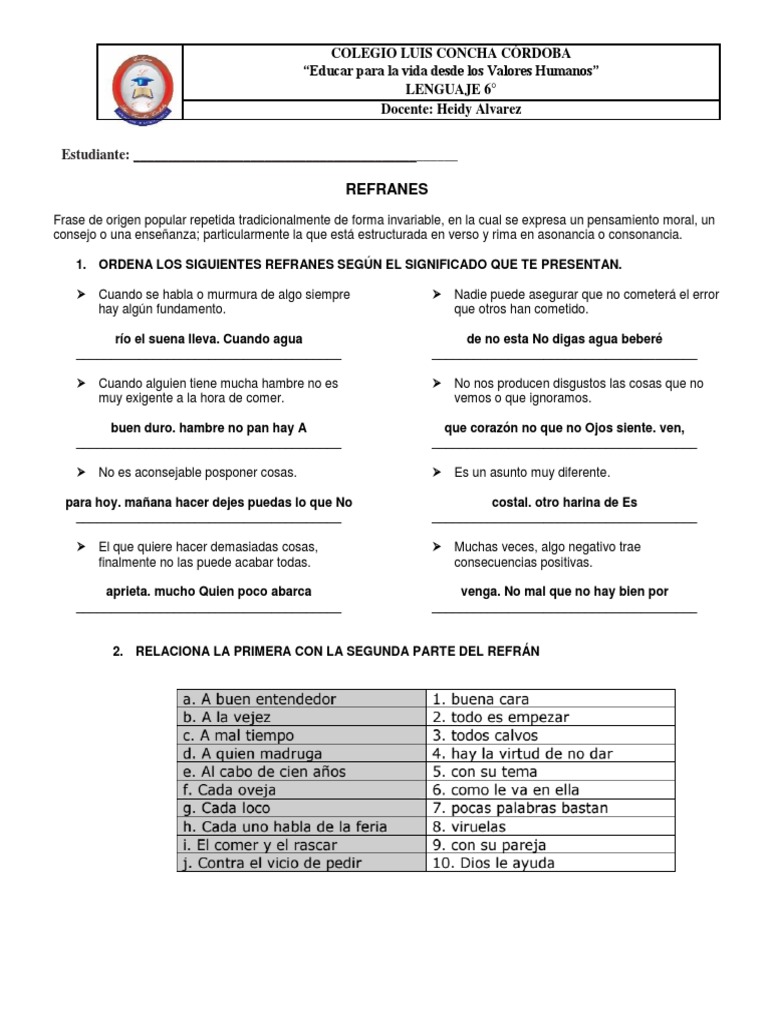 1. ORDENA LOS SIGUIENTES REFRANES SEGÚN EL SIGNIFICADO QUE TE PRESENTAN.