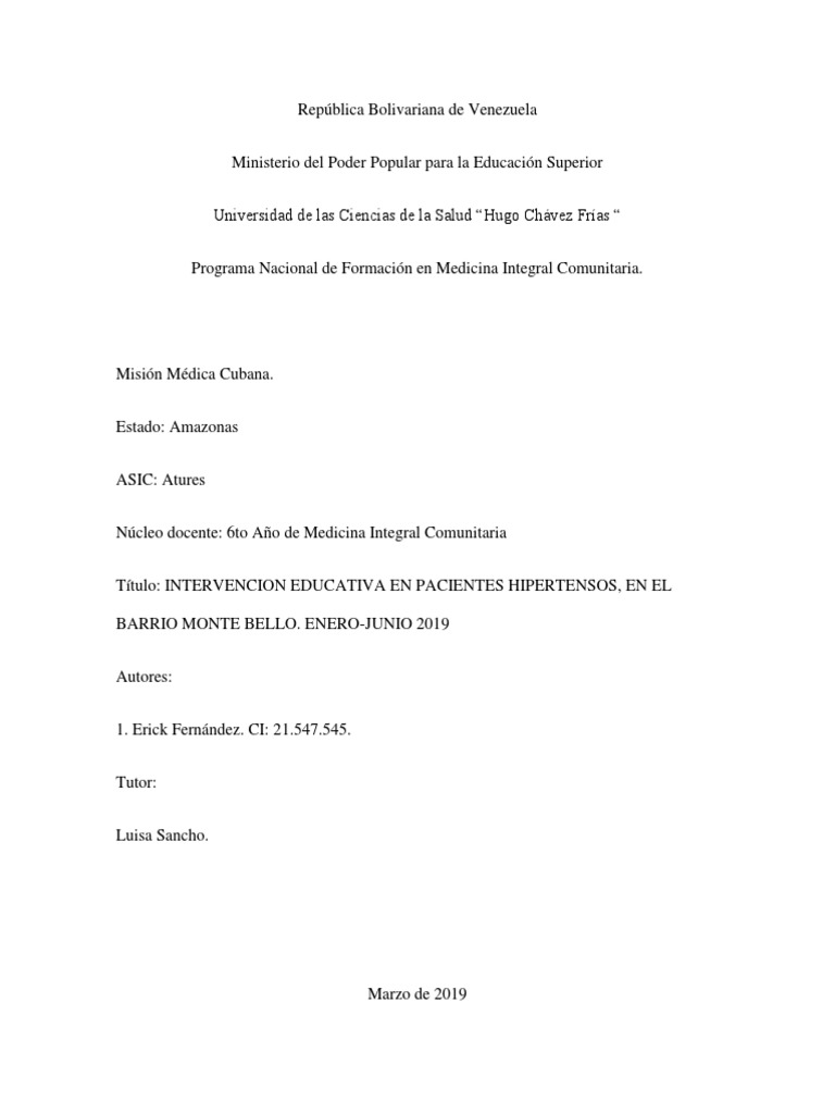 Título: INTERVENCION EDUCATIVA EN PACIENTES HIPERTENSOS, EN EL