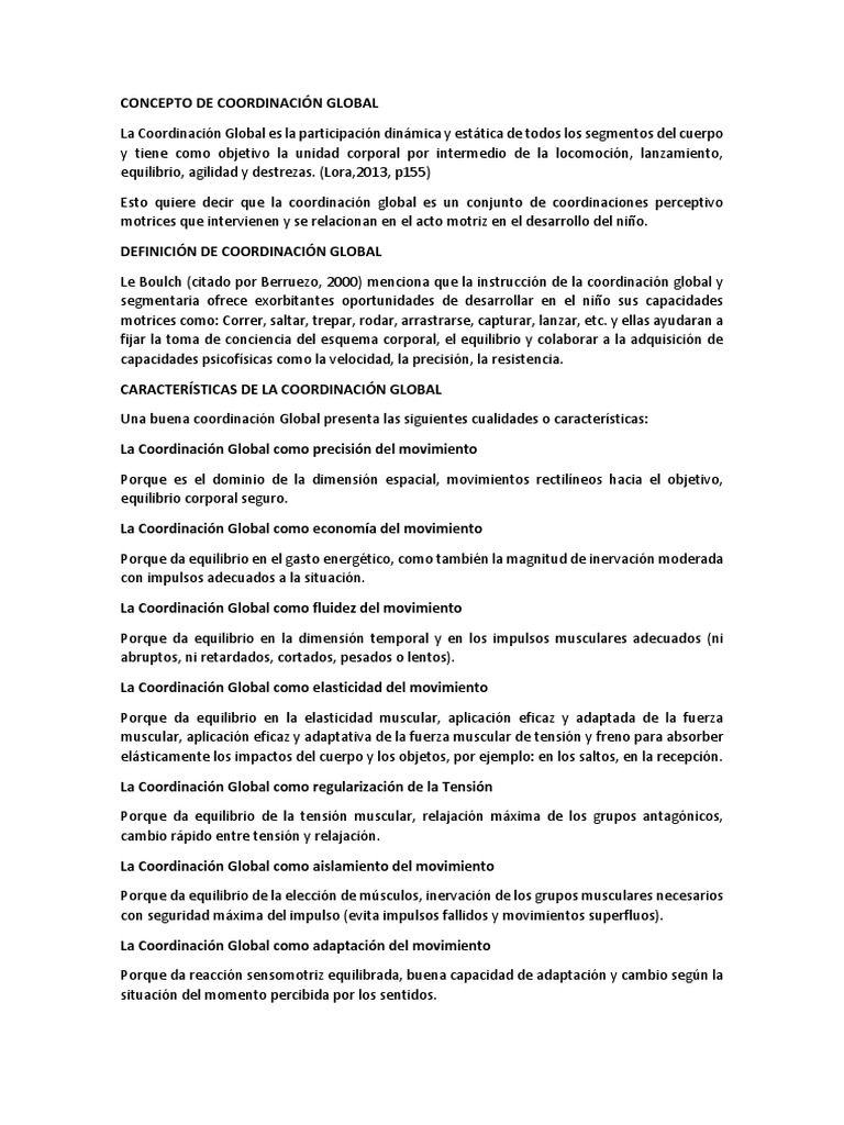 Lora (1991) define: “La coordinación global, es esencialmente de carácter neuromuscular que