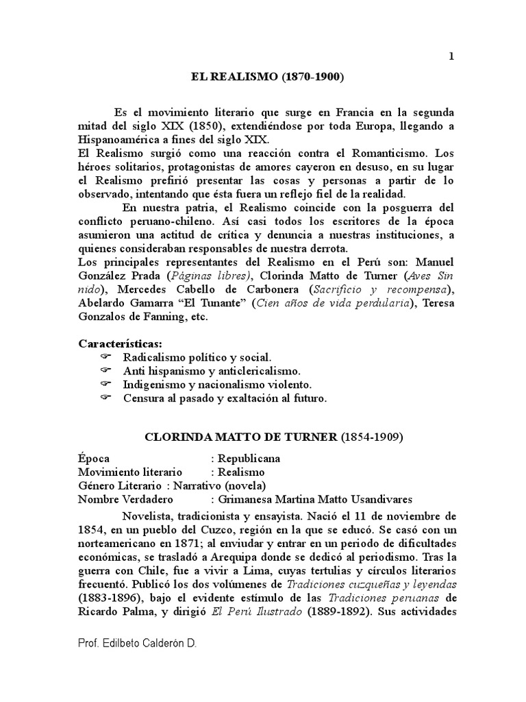 Los principales representantes del Realismo en el Perú son: Manuel