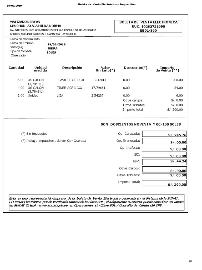 Esta es una representación impresa de la boleta de Venta Electrónica generada en el Sistema de la SUNAT.