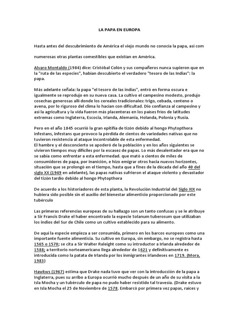 Más adelante señala: la papa "el tesoro de las indias", entró en forma oscura e