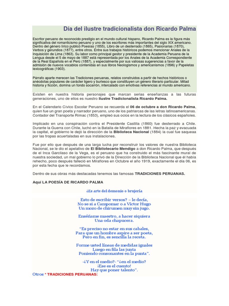 generaciones, uno de ellos es nuestro Ilustre Tradicionalista Ricardo Palma.