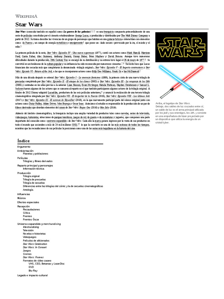Esta obra contiene una traducción parcial derivada de Star Wars de Wikipedia en inglés, publicada por sus editores (https://en.wikipedia.org/wiki/Star_Wars?action=history)