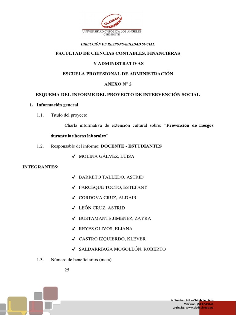 ESQUEMA DEL INFORME DEL PROYECTO DE INTERVENCIÓN SOCIAL