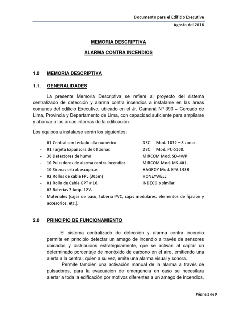 La presente Memoria Descriptiva se refiere al proyecto del sistema