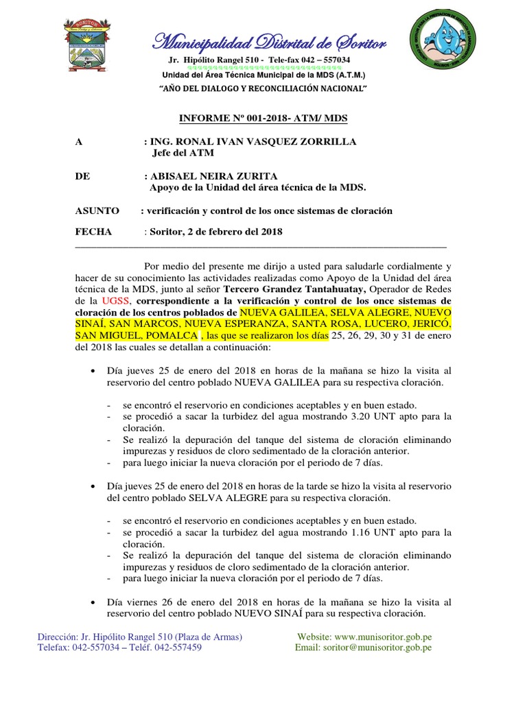 cloración de los centros poblados de NUEVA GALILEA, SELVA ALEGRE, NUEVO