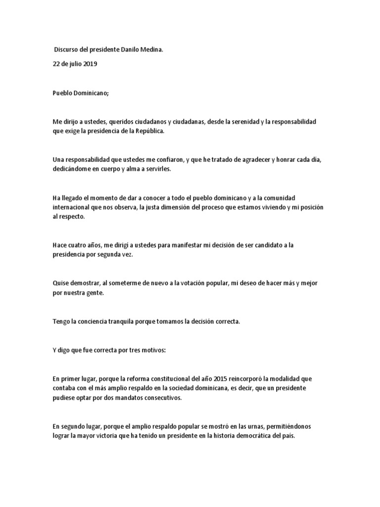 Discurso Del Presidente Danilo Medina Al Pueblo Dominicano-22 de Julio de 2019