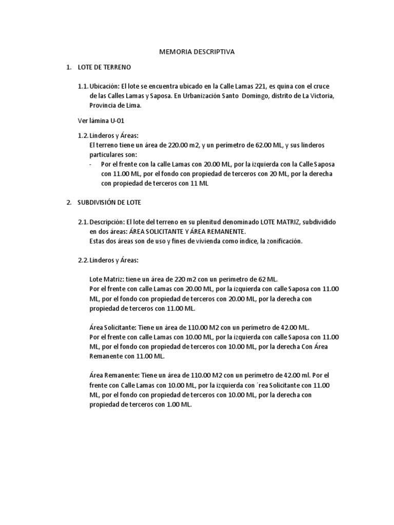 2.1. Descripción: El lote del terreno en su plenitud denominado LOTE MATRIZ, subdividido