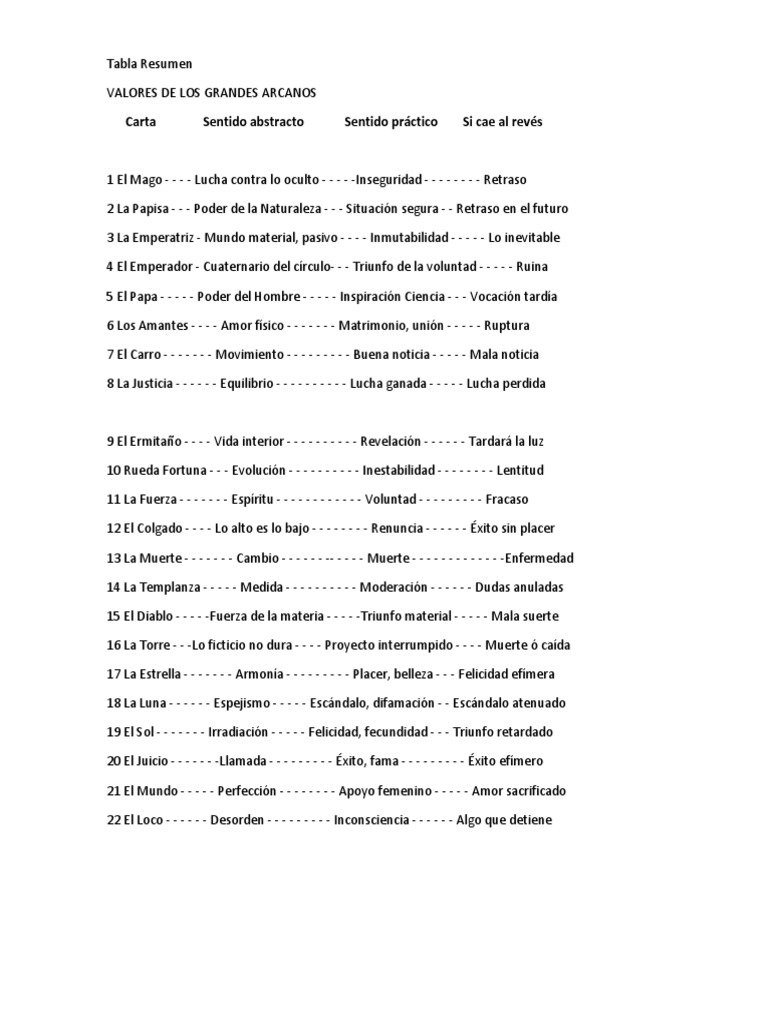 Tabla Resumen Arcanos Mayores - Significado