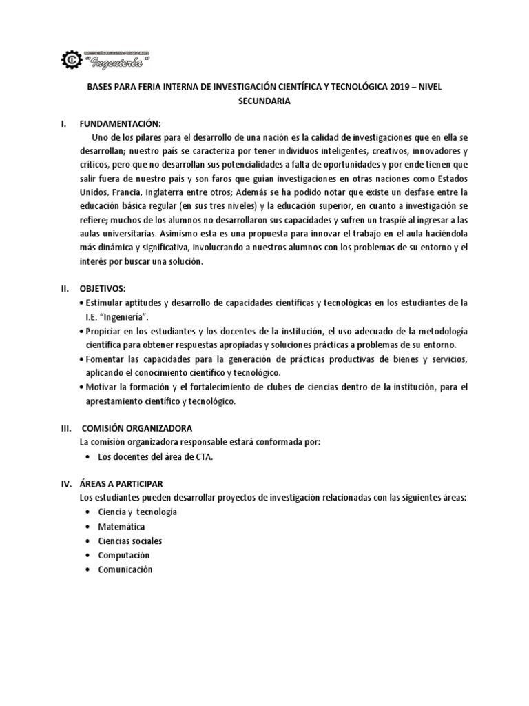 BASES PARA FERIA INTERNA DE INVESTIGACIÓN CIENTÍFICA Y TECNOLÓGICA 2019 – NIVEL