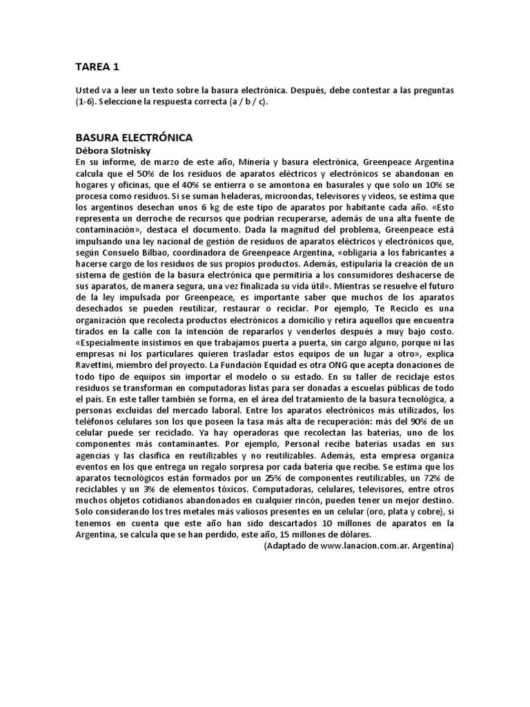 Usted va a leer un texto sobre la basura electrónica. Después, debe contestar a las preguntas