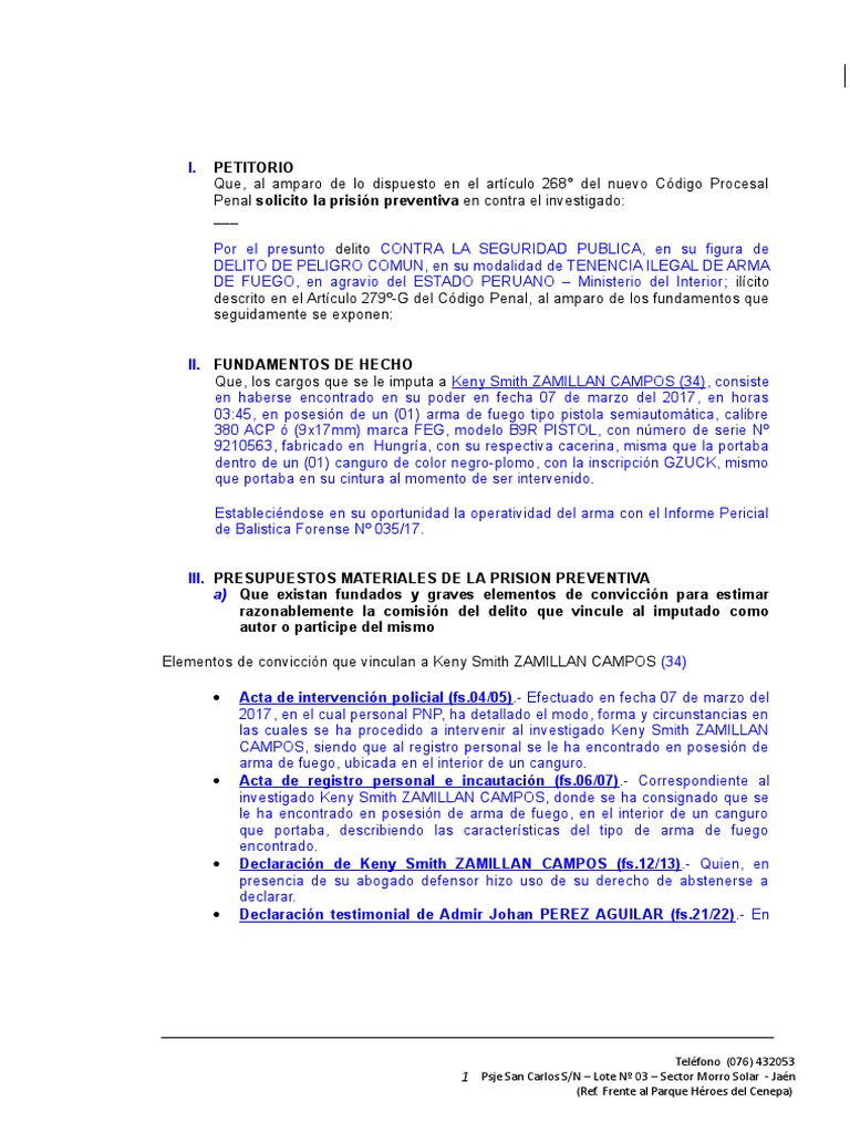 investigado Keny Smith ZAMILLAN CAMPOS, donde se ha consignado que se