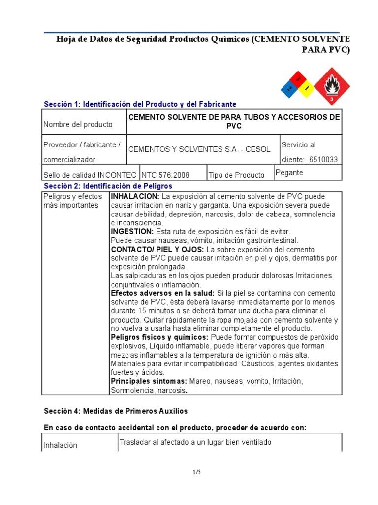 Hoja de Datos de Seguridad Productos Químicos (CEMENTO SOLVENTE