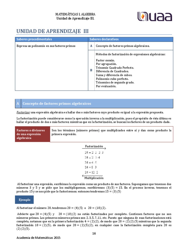 1. Expresa un polinomio en sus factores primos A Concepto de factores primos algebraicos.