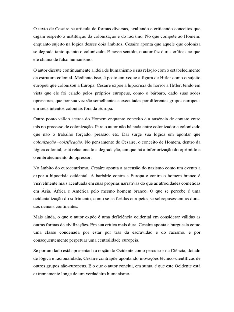 O texto de Cesaire se articula de formas diversas, avaliando e criticando conceitos que