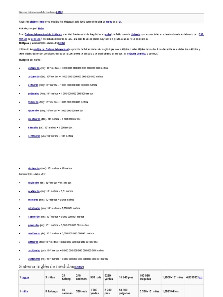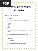 submúltiplos del metro, aceptados dentro del SI, junto con su símbolo y su equivalencia en metros, en notación científica y decimal.7