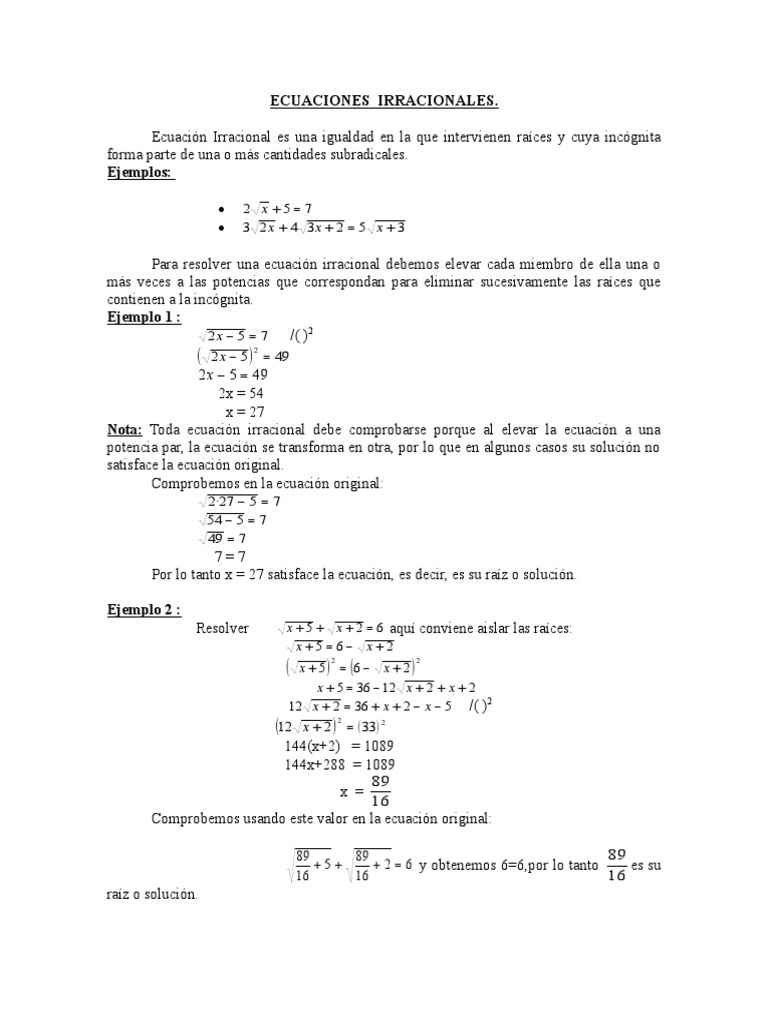 Nota: Toda ecuación irracional debe comprobarse porque al elevar la ecuación a una
